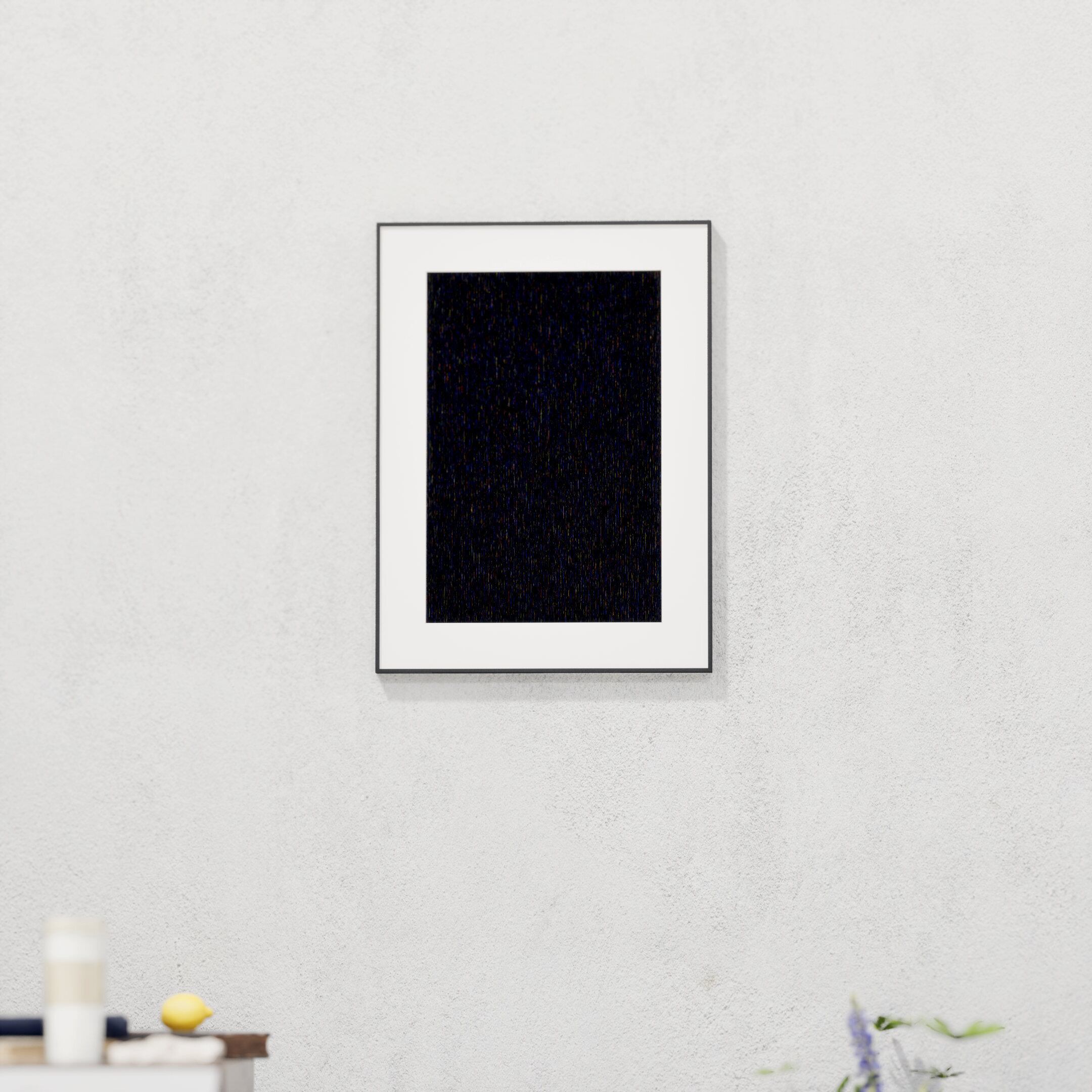 額縁の色は、黒とシルバーからお選びいただけます。(色は、壁面やお部屋にどちらが合うかでご判断いただくと分かりやすいと思います。額縁は厚みが 2cm 程度あり、横から見ると色による存在感がそこそこあります。